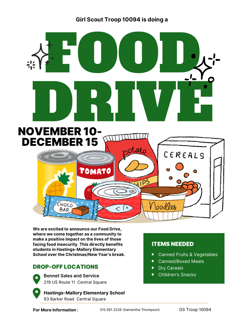 Our local Girl Scout Troop 10094 is working hard to support the community with a Food Drive. Let's help them reach their goal!They are collecting non-perishable food items (canned goods, dry pasta,...